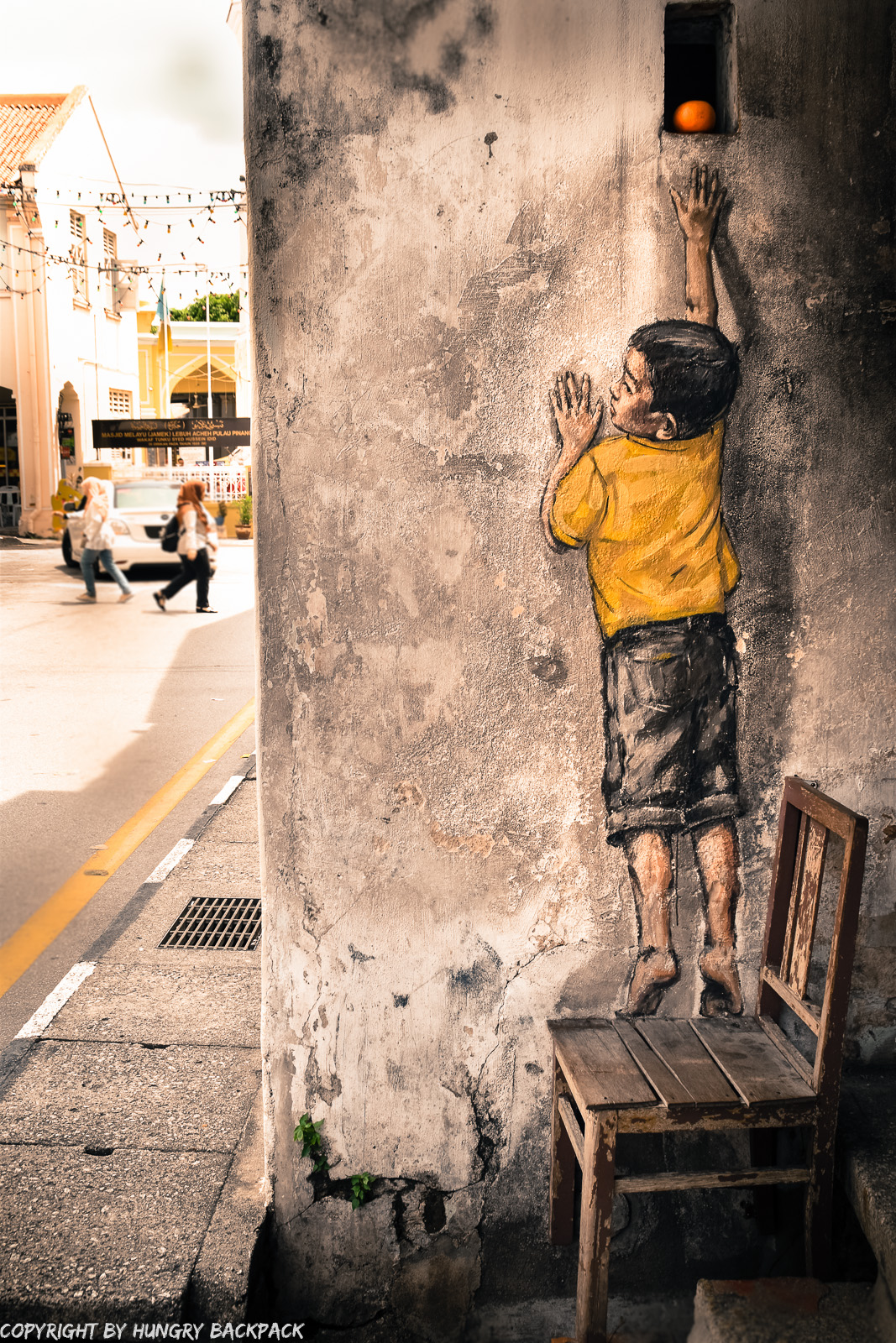 “Reaching Up” is another famous piece by Ernest Zacharevic which he painted during the 2012 Georgetown Festival. The “Reaching Up” mural shows a little boy reaching for a hole in the wall.