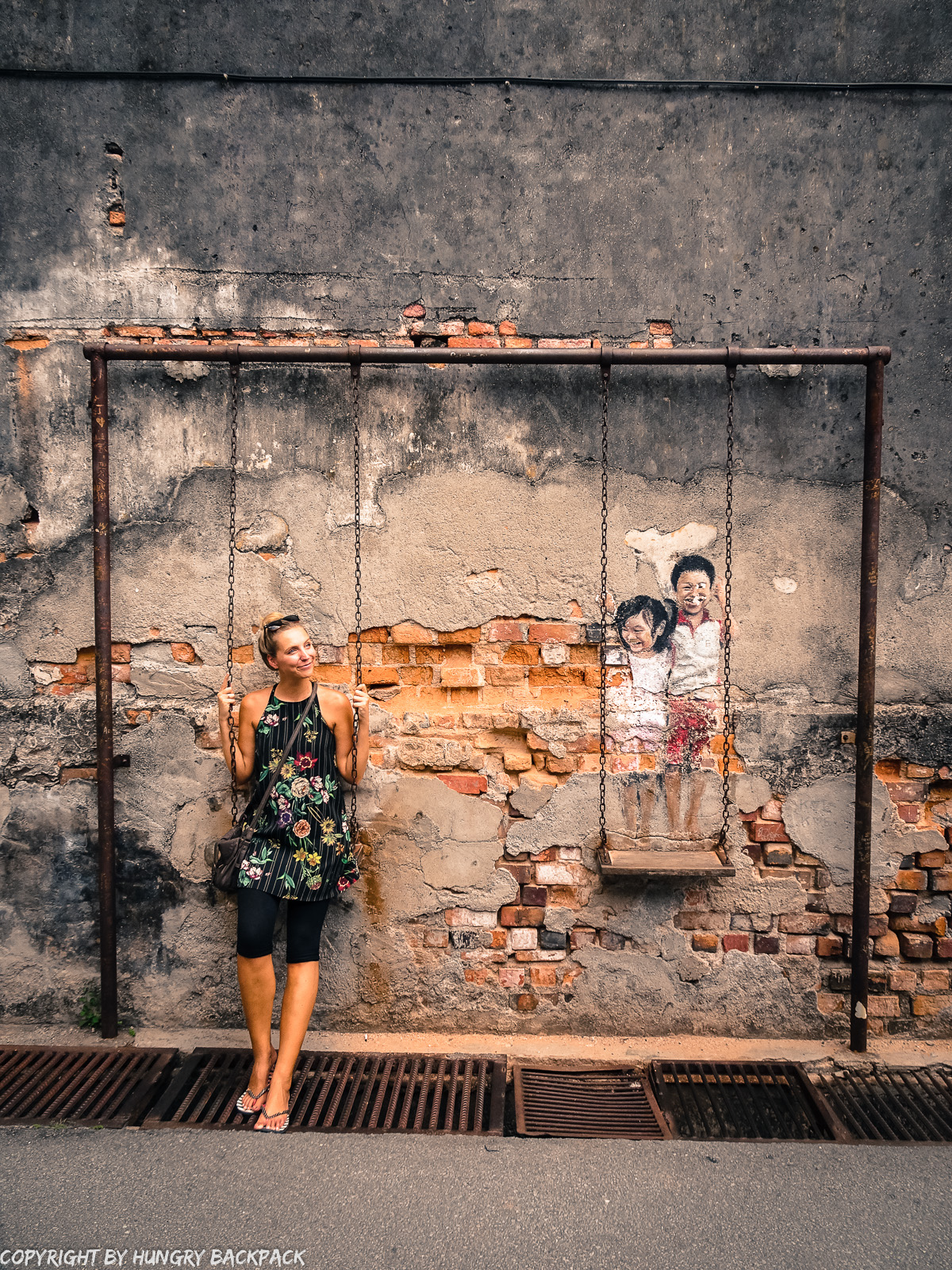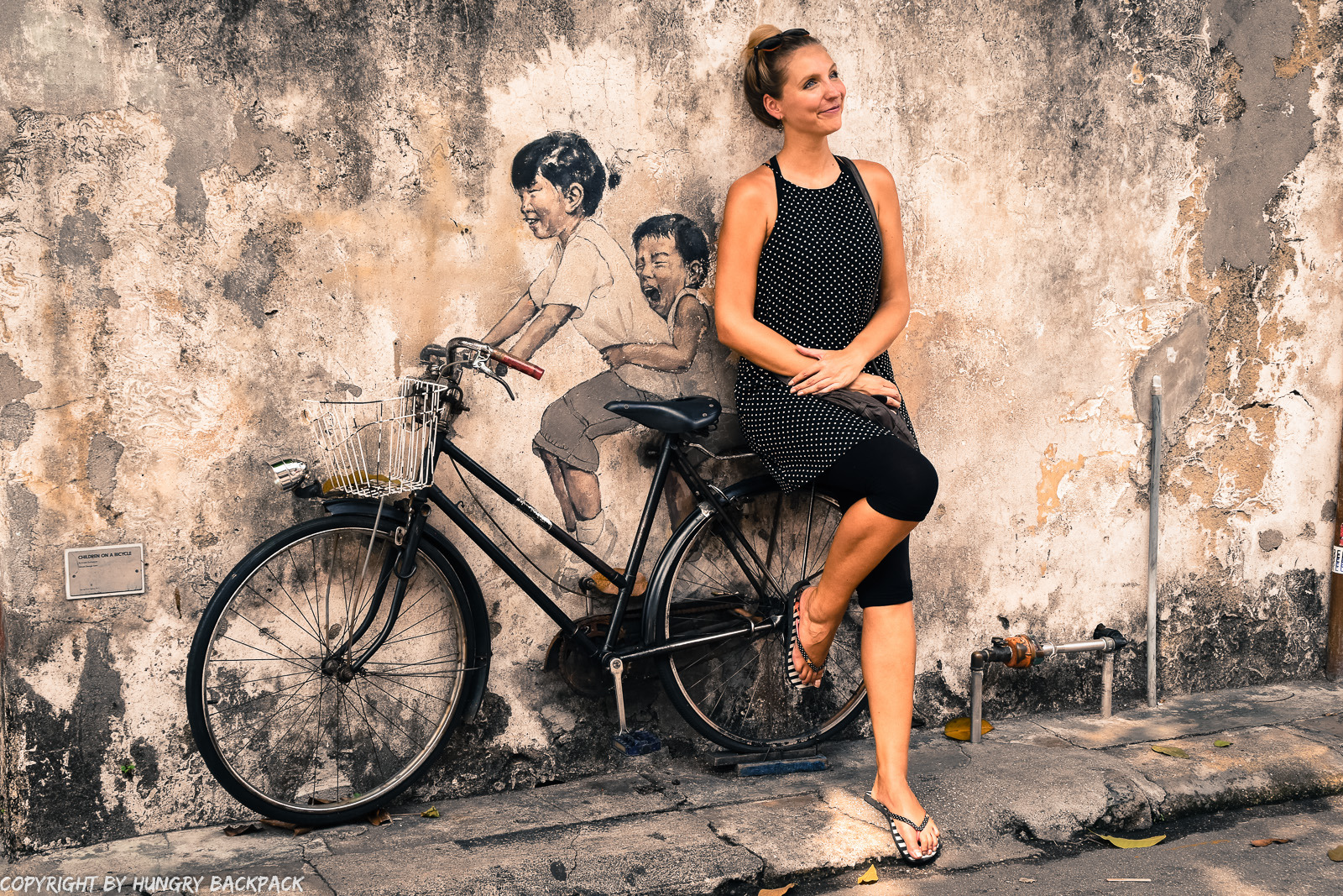 No day passes that we’re scrolling through our IG feed and don’t see one of our fellow traveller friends posing next (or right in the middle) these cool street art designs and we absolutely love them – WHY? Well first of all we’re crazy about street art in general but especially love these murals and designs in George Town as they are different from most of the graffiti -based street art we know. Penang’s street art is cute, creative and most of all playful!